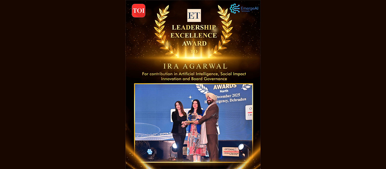 Dehradun, India | 2025 — Ira Agarwal, globally recognized leader in Artificial Intelligence, board governance, and purpose-driven innovation, has been conferred the 🌟 ET Leadership Excellence Award 2025 🌟 by The Times of India and The Economic Times. The award recognizes her high-impact and globally significant contributions to advancing responsible Artificial Intelligence and progressive boardroom leadership.